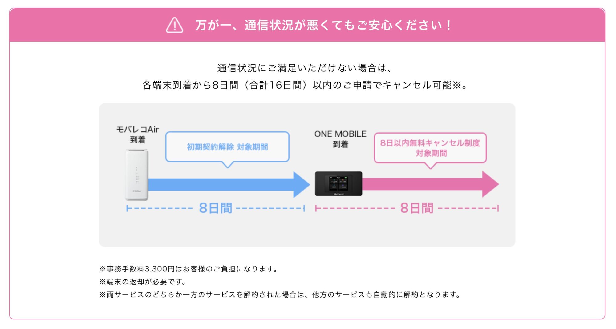 もし実際に利用してみて、通信品質に満足できない場合は、契約開始から8日以内であれば、電気通信事業法で定めらている「初期契約解除制度」により無条件で解約が可能です。